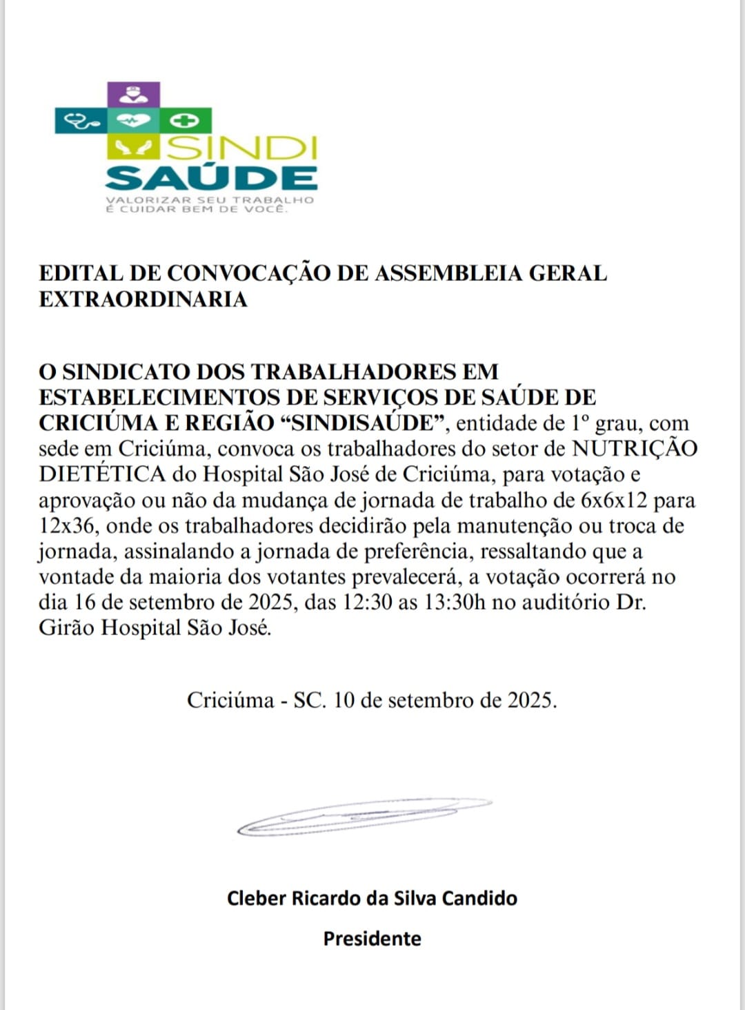 ASSEMBLEIA ALTERAÇÃO JORNADA DE TRABALHO SETOR NUTRIÇÃO DIETÉTICA HOSP. SÃO JOSÉ