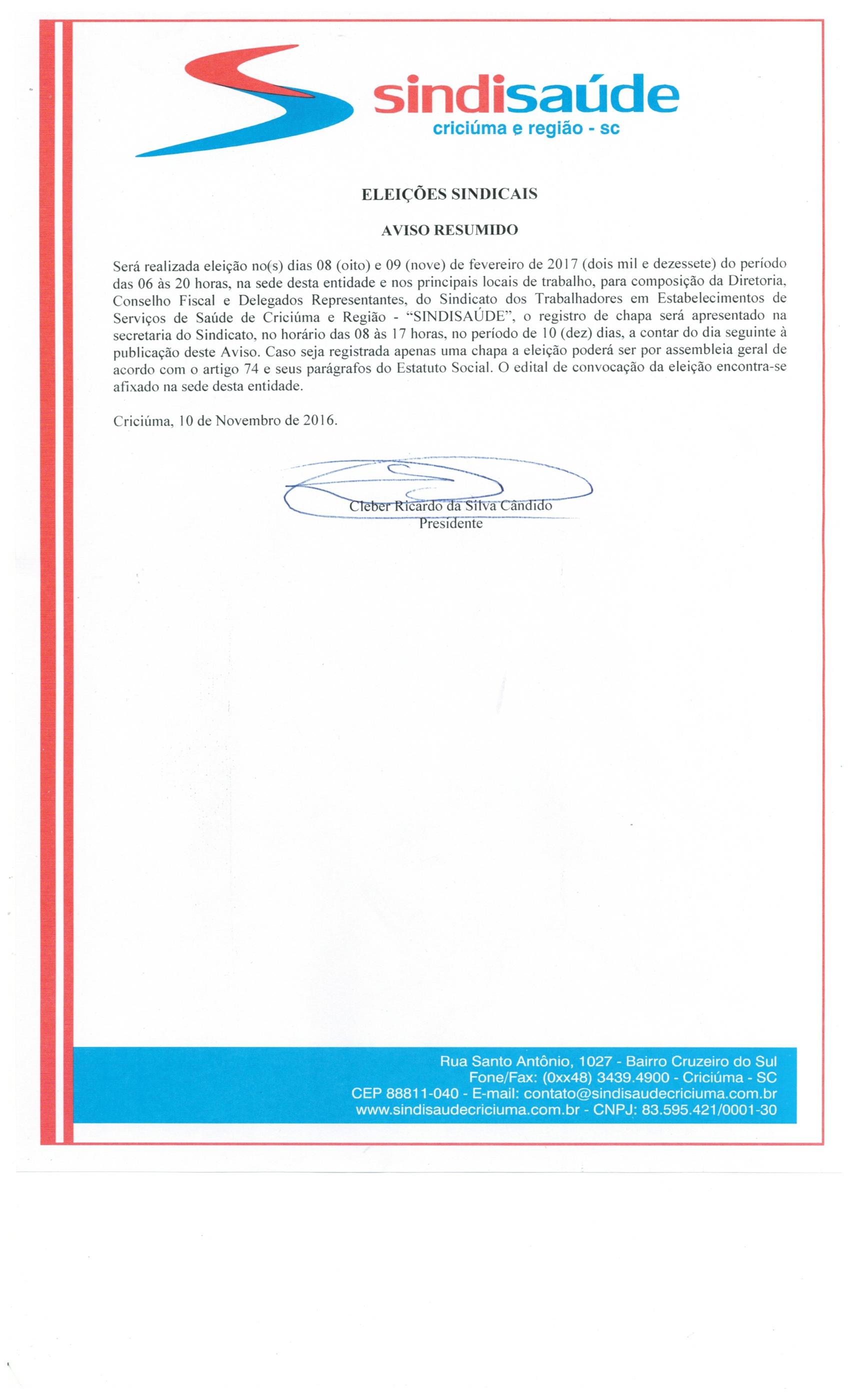 AVISO RESUMIDO ELEIÇÕES SINDICAIS DO SINDISAÚDE