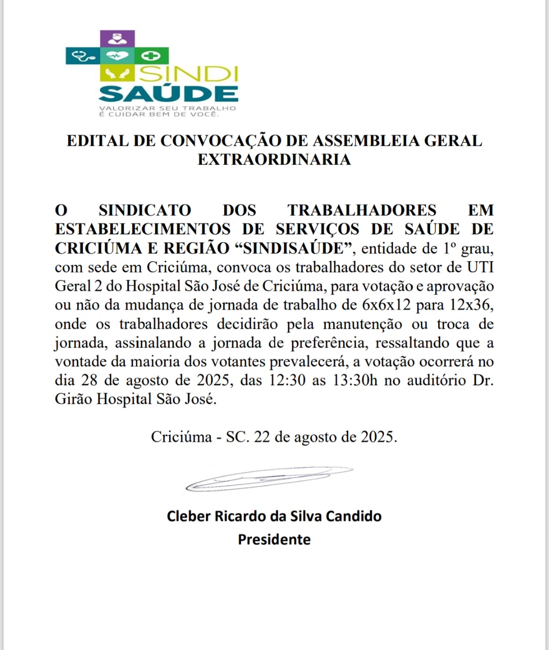 com sede em Criciúma, convoca os trabalhadores do setor de UTI