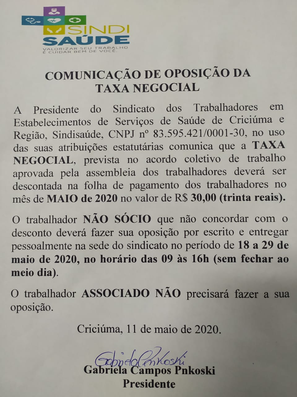 EDITAL DE COMUNICAÇÃO DE OPOSIÇÃO DA TAXA NEGOCIAL HOSPITAIS: SÃO JOSÉ, SÃO JOÃO BATISTA, IDEAS - HMISC, SÃO DONATO DE IÇARA, IMAS - NOVA VENEZA, CONSULTÓRIOS E CLINICAS