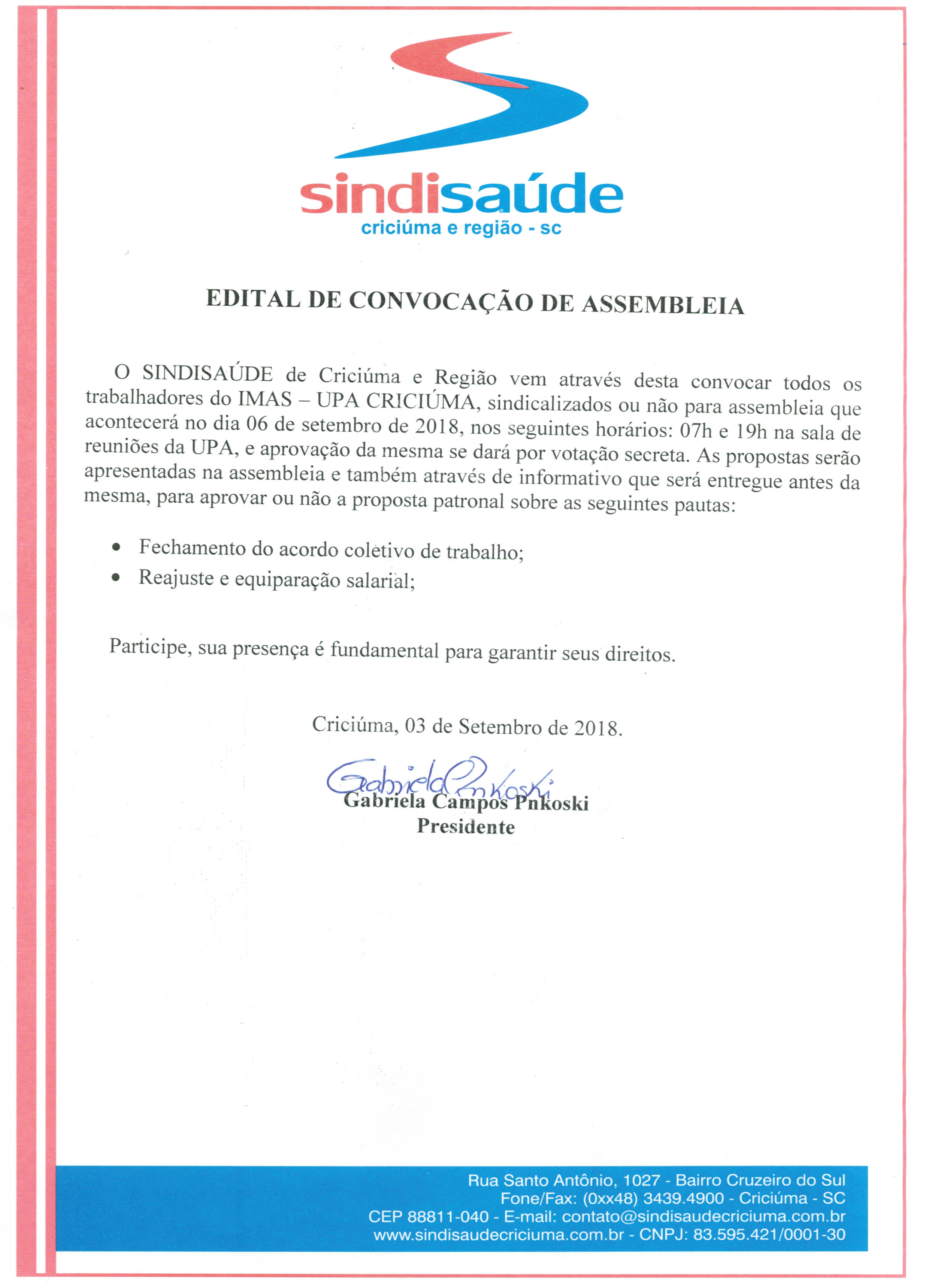 EDITAL DE CONVOCAÇÃO ASSEMBLEIA IMAS - UPA CRICIÚMA