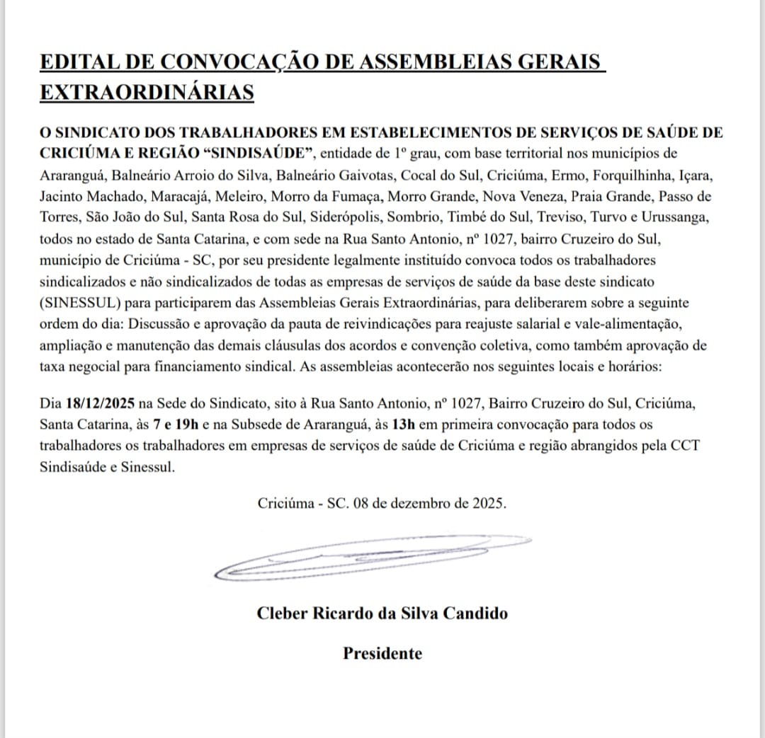 Dia 18/12/2025 na Sede do Sindicato, sito à Rua Santo Antonio, nº 1027, Bairro Cruzeiro do Sul, Criciúma, Santa Catarina, às 7 e 19h e na Subsede de Araranguá, às 13h em primeira convocação para todos os trabalhadores os trabalhadores em empresas de serviços de saúde de Criciúma e região abrangidos pela CCT Sindisaúde e Sinessul.