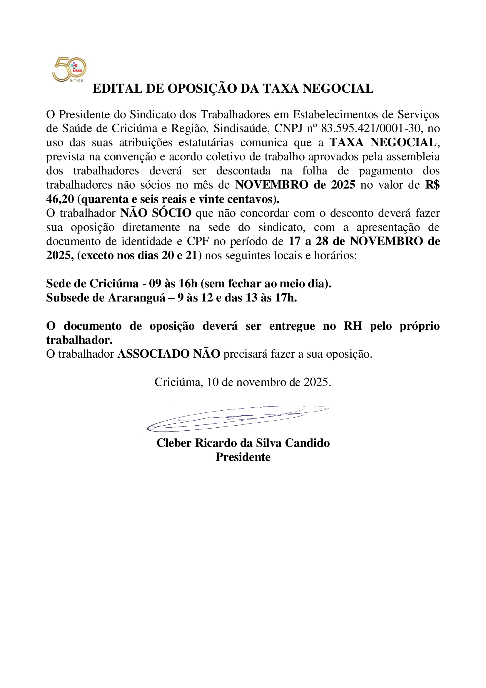 O Presidente do Sindicato dos Trabalhadores em Estabelecimentos de Serviços de Saúde de Criciúma e Região, Sindisaúde, CNPJ nº 83.595.421/0001-30, no uso das suas atribuições estatutárias comunica que a TAXA NEGOCIAL, prevista na convenção e acordo coletivo de trabalho aprovados pela assembleia dos trabalhadores deverá ser descontada na folha de pagamento dos trabalhadores não sócios no mês de NOVEMBRO de 2025 no valor de R$ 46,20 (quarenta e seis reais e vinte centavos).