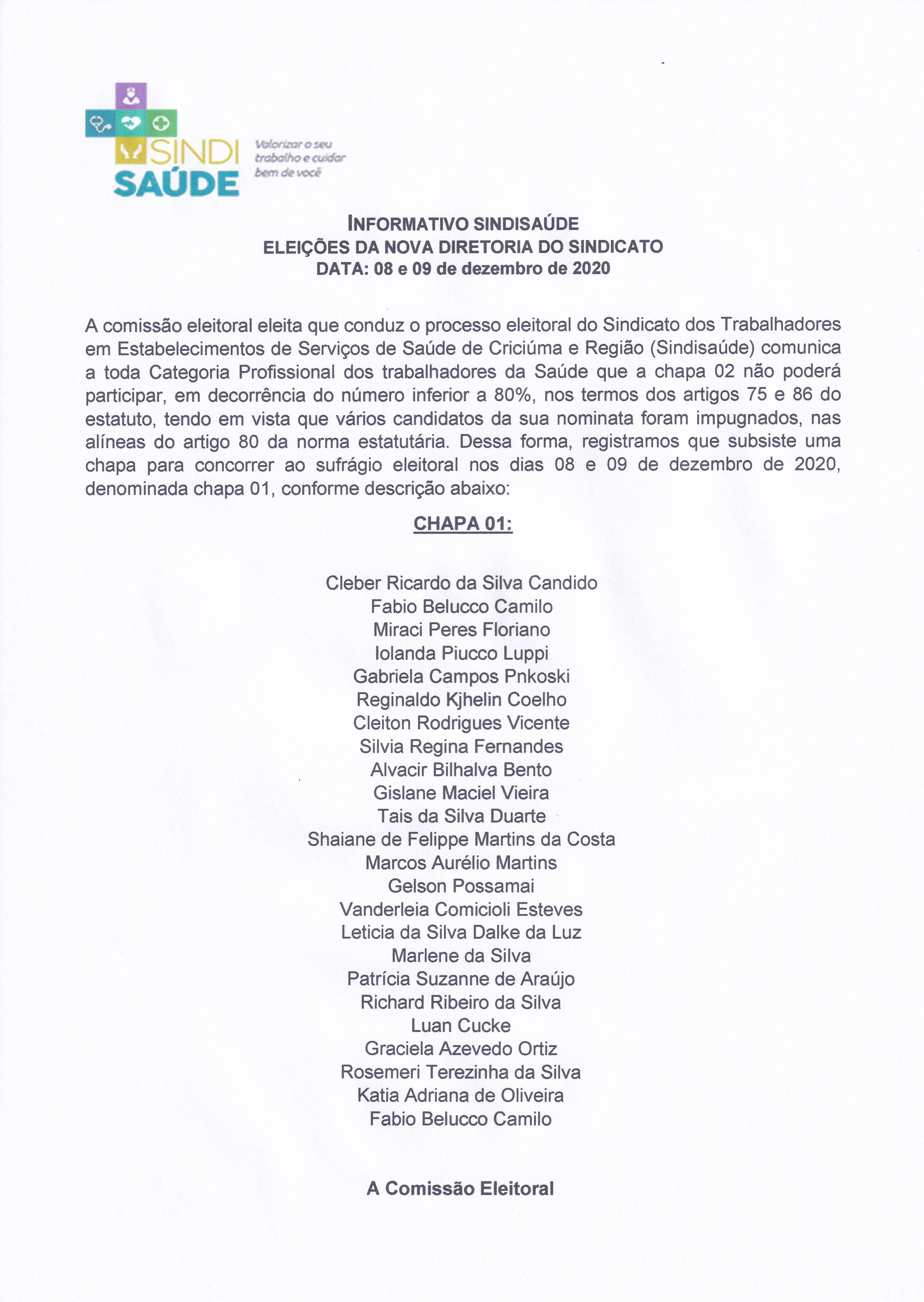 INFORMATIVO ELEIÇÕES DA NOVA DIRETORIA DO SINDISAÚDE