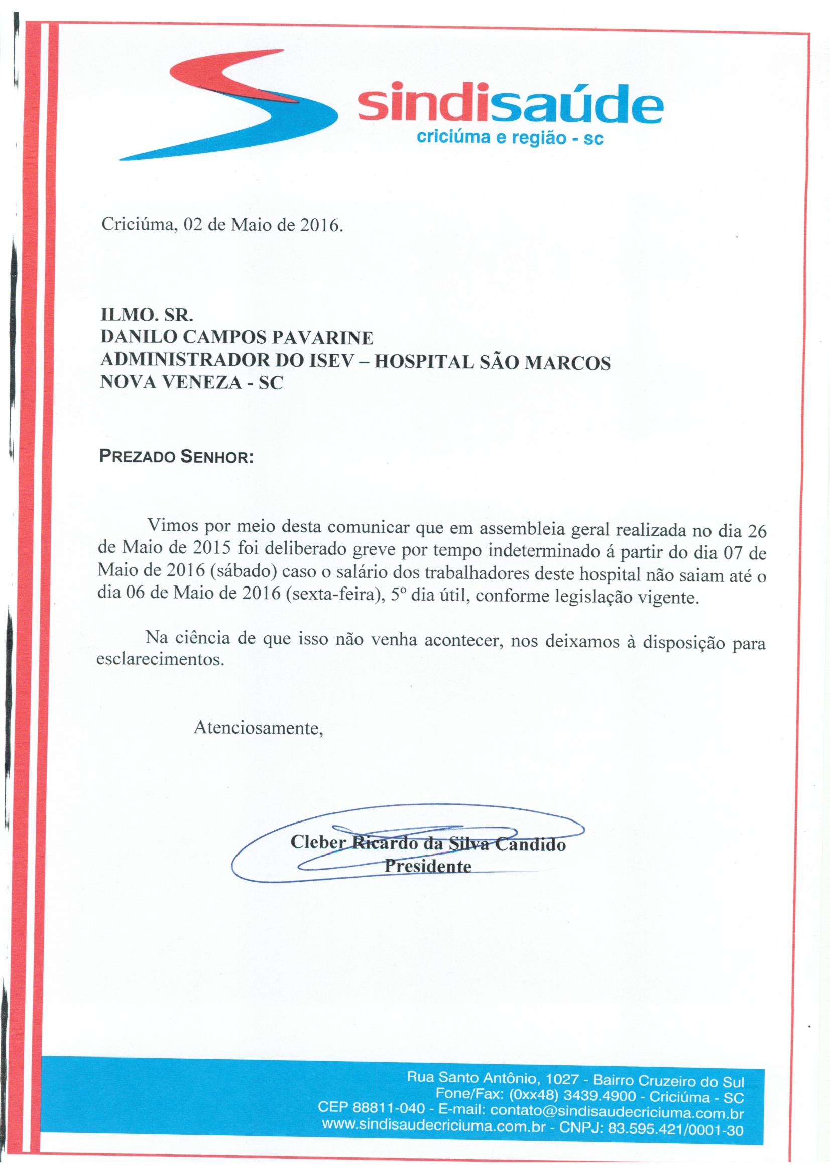OFÍCIO ATRASO PAGAMENTO DE SALÁRIO ISEV/H.S.MARCOS