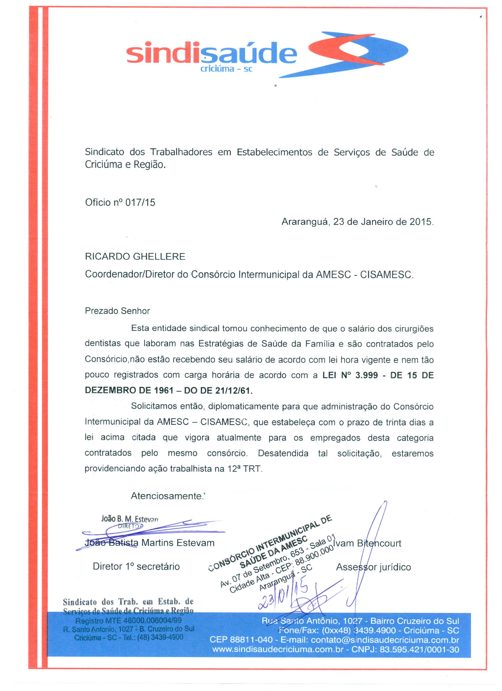 Ofício Cisamesc sobre salário dos dentistas