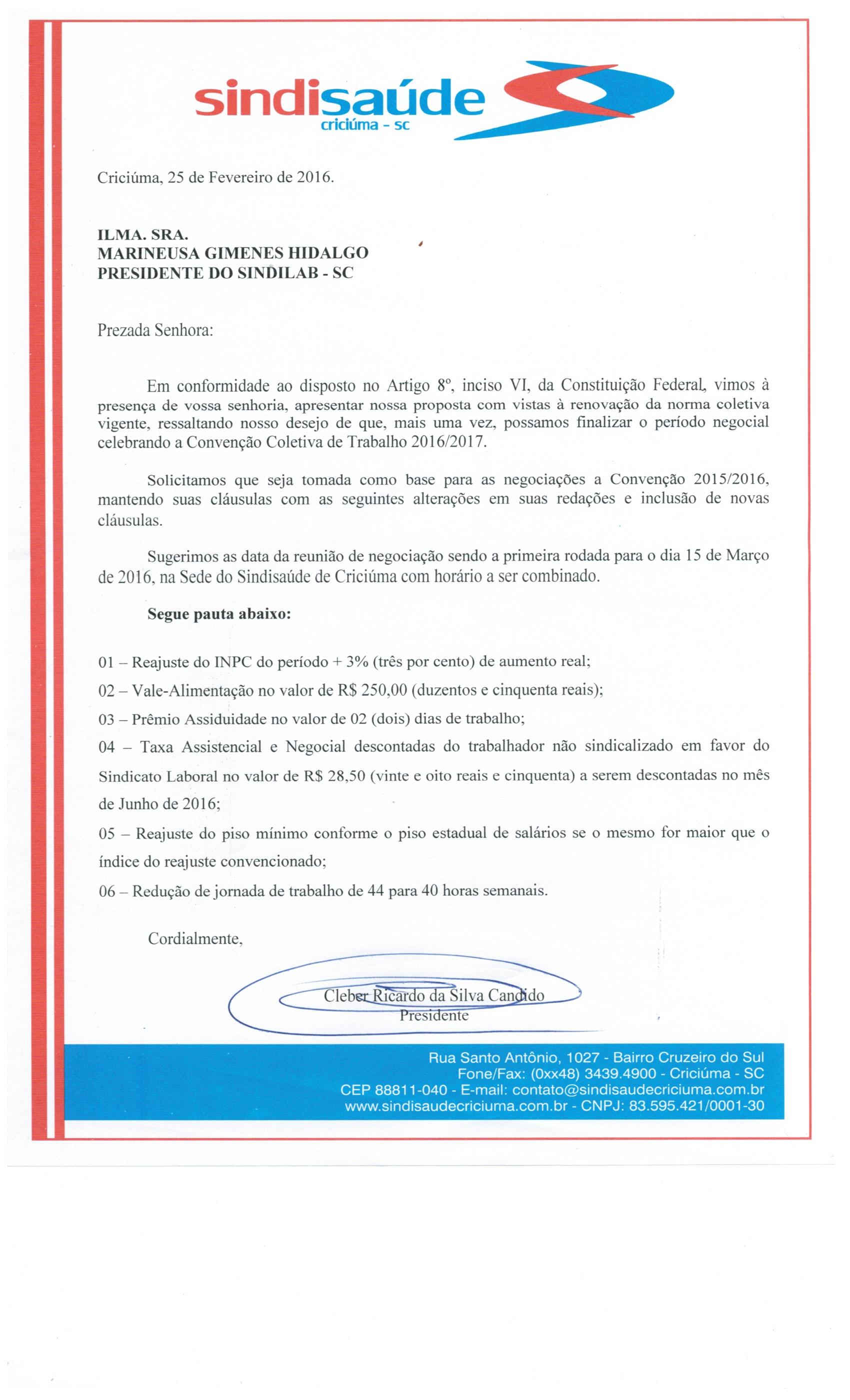 Ofício com a pauta de reivindicação encaminhado ao SINDILAB