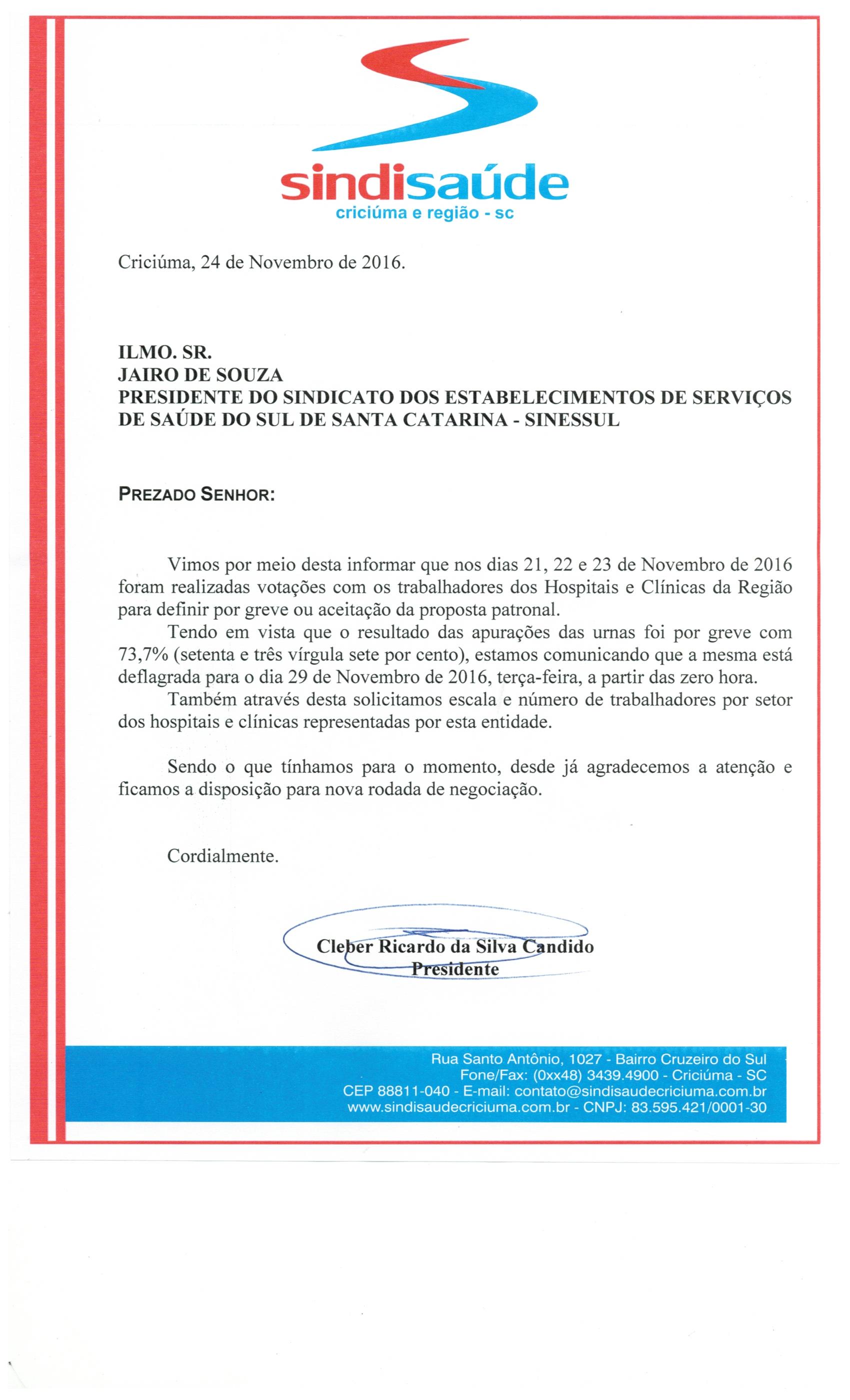 OFÍCIO COMUNICAÇÃO DE GREVE GERAL DA CATEGORIA A PARTIR DO DIA 29 DE NOVEMBRO DE 2016