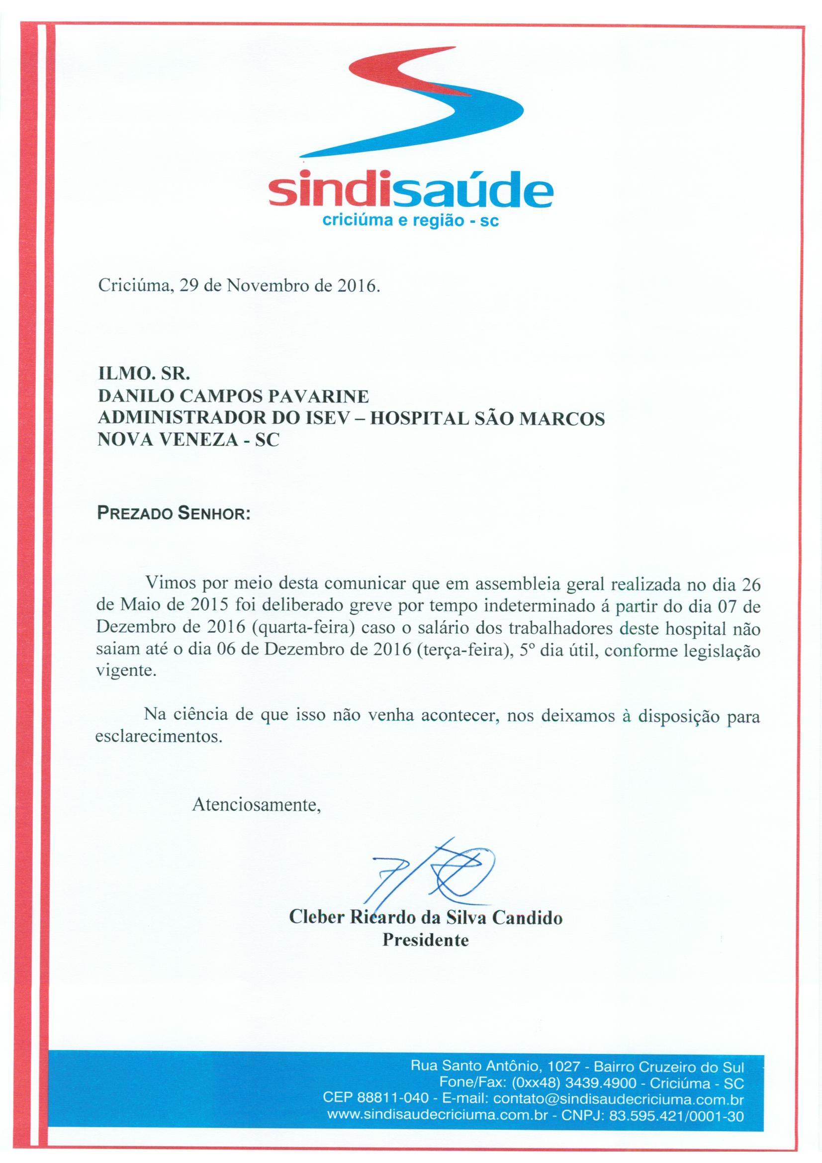 OFÍCIO COMUNICAÇÃO DE GREVE POR ATRASO DE PAGAMENTO DE SALÁRIO - ISEV - NOVA VENEZA