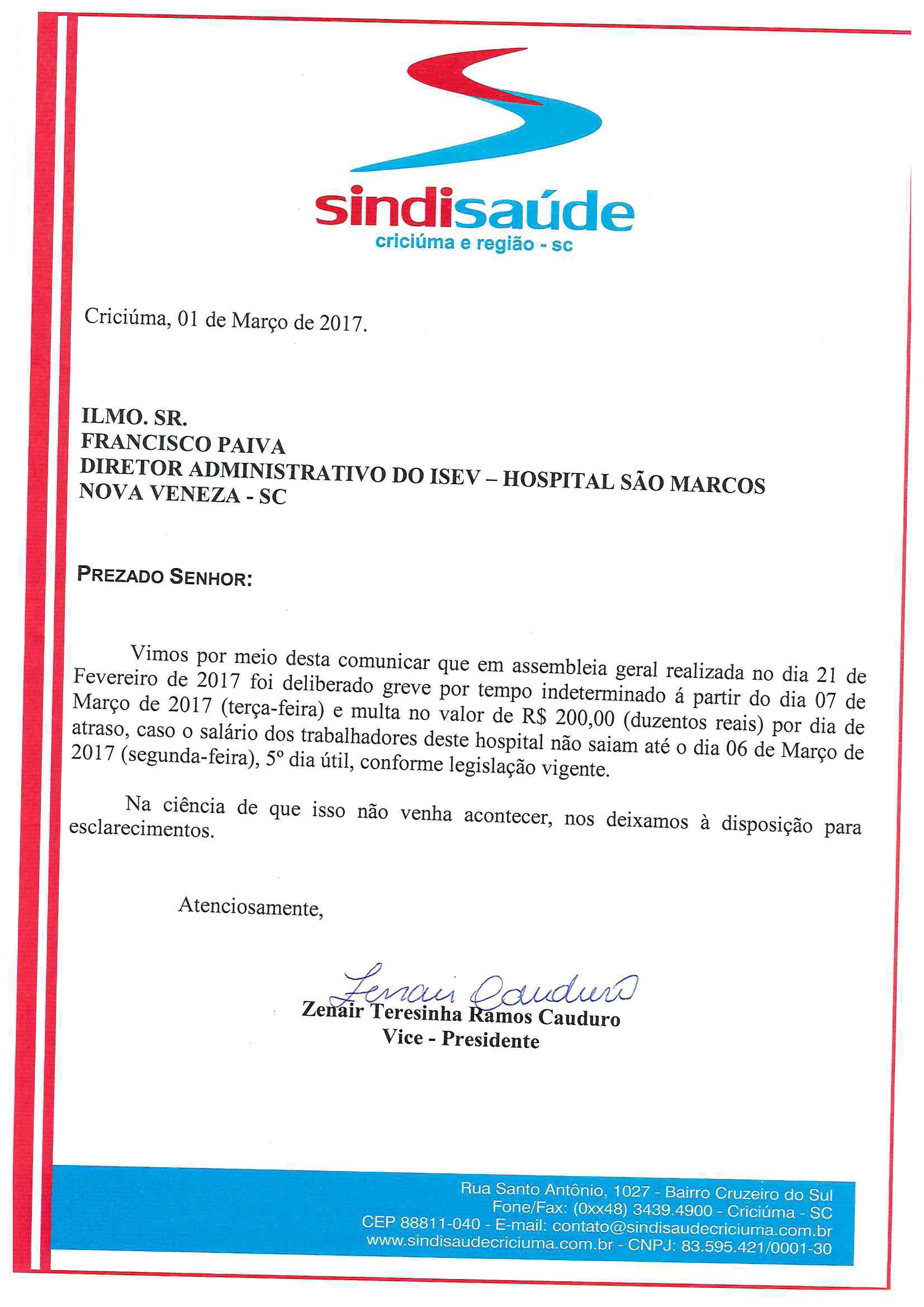 OFÍCIO COMUNICAÇÃO DE GREVE POR ATRASO DE SALÁRIOS ISEV - NOVA VENEZA