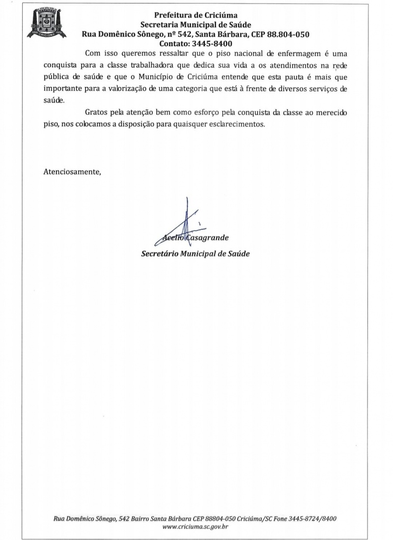 Ofício da Secretaria de Saúde sobre as verbas para o pagamento do Piso da Enfermagem