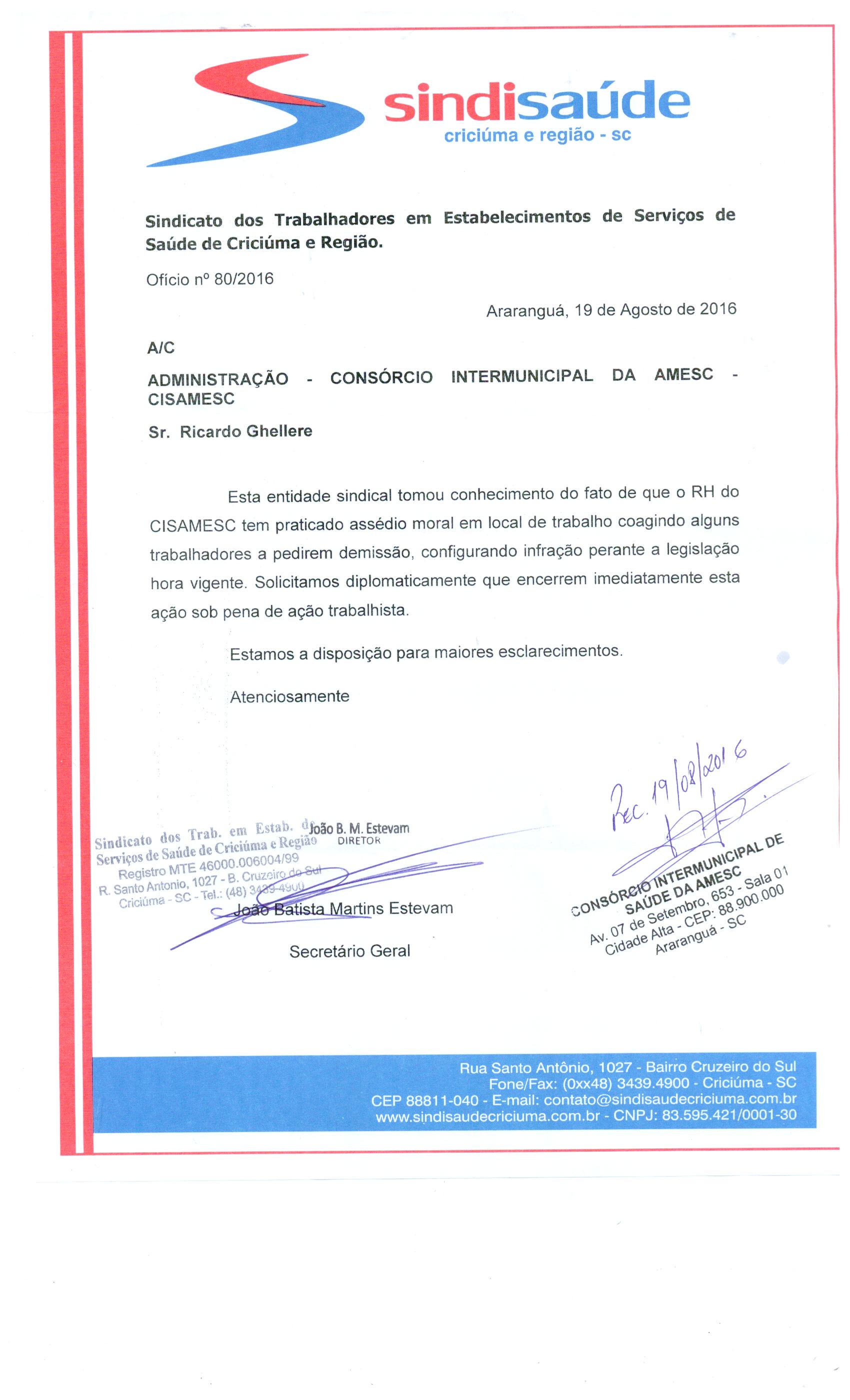 Oficio encaminhado a Consorcio Intermunicipal da Amesc- Cisamesc