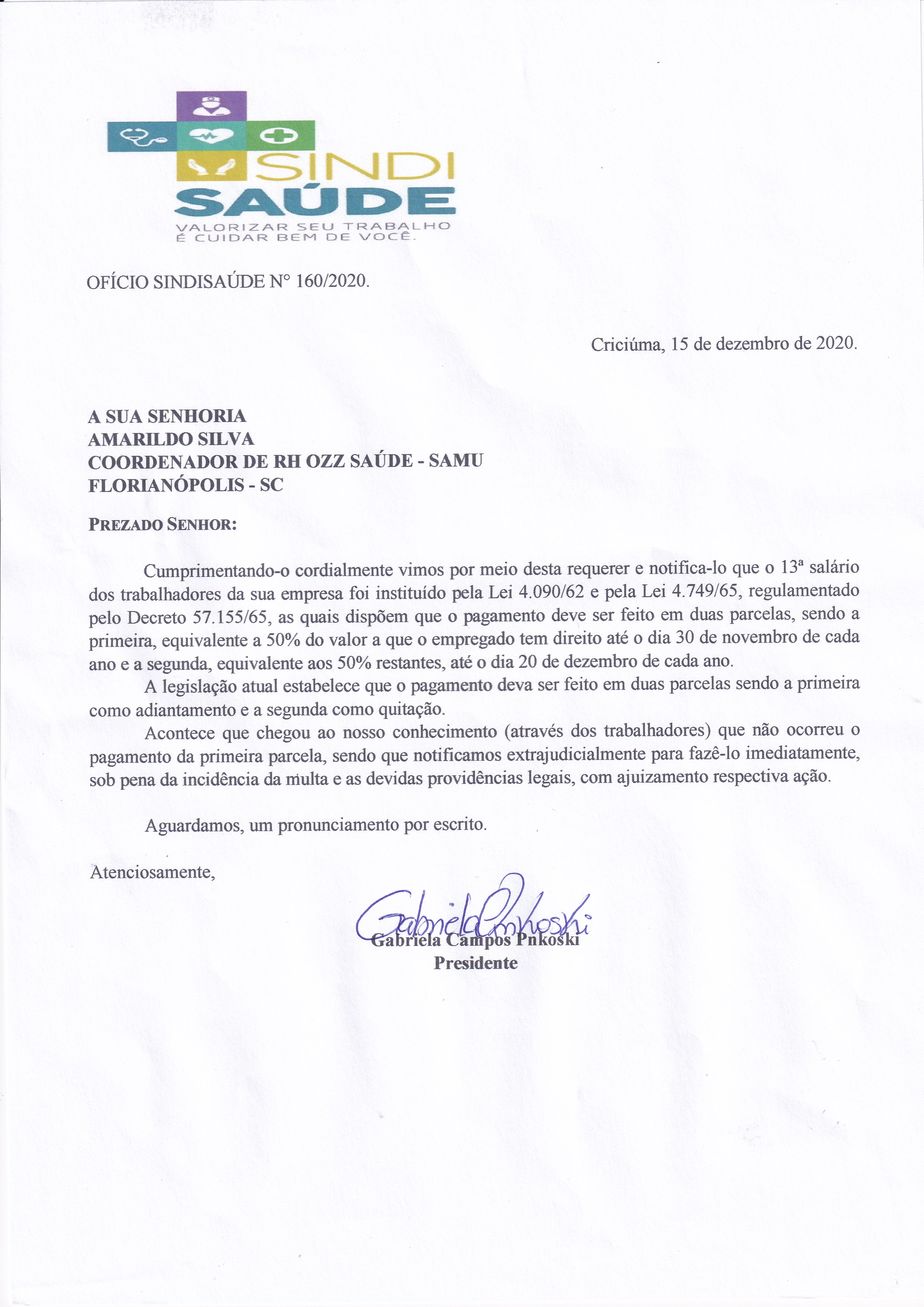 OFÍCIO ENCAMINHADO A OZZ SAÚDE SAMÚ SOBRE ATRASO PAGAMENTO DO 13 SALÁRIO