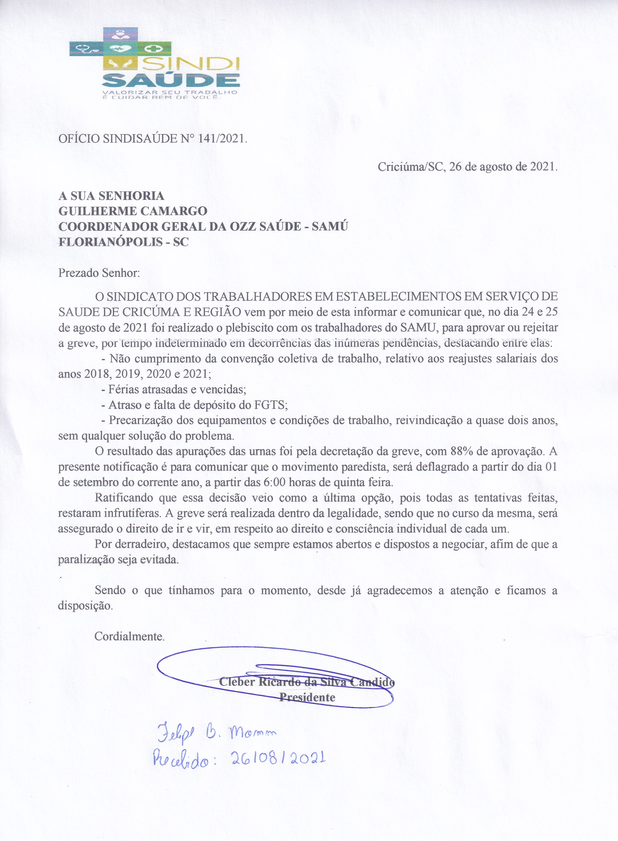 OFÍCIO ENCAMINHADO A OZZ SAÚDE SOBRE GREVE DO SAMU