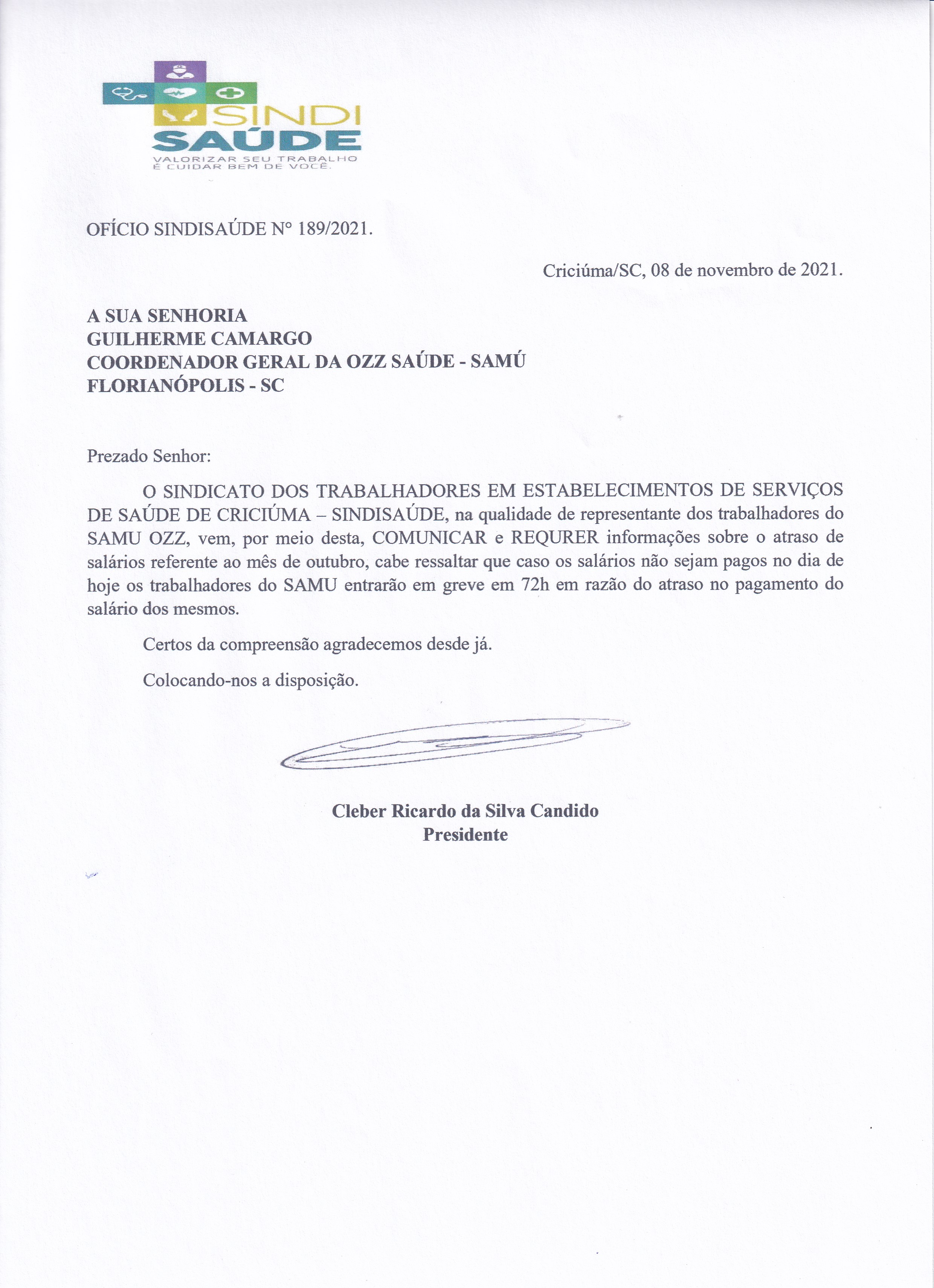 Ofício encaminhado a Ozz Saúde sobre greve Samu