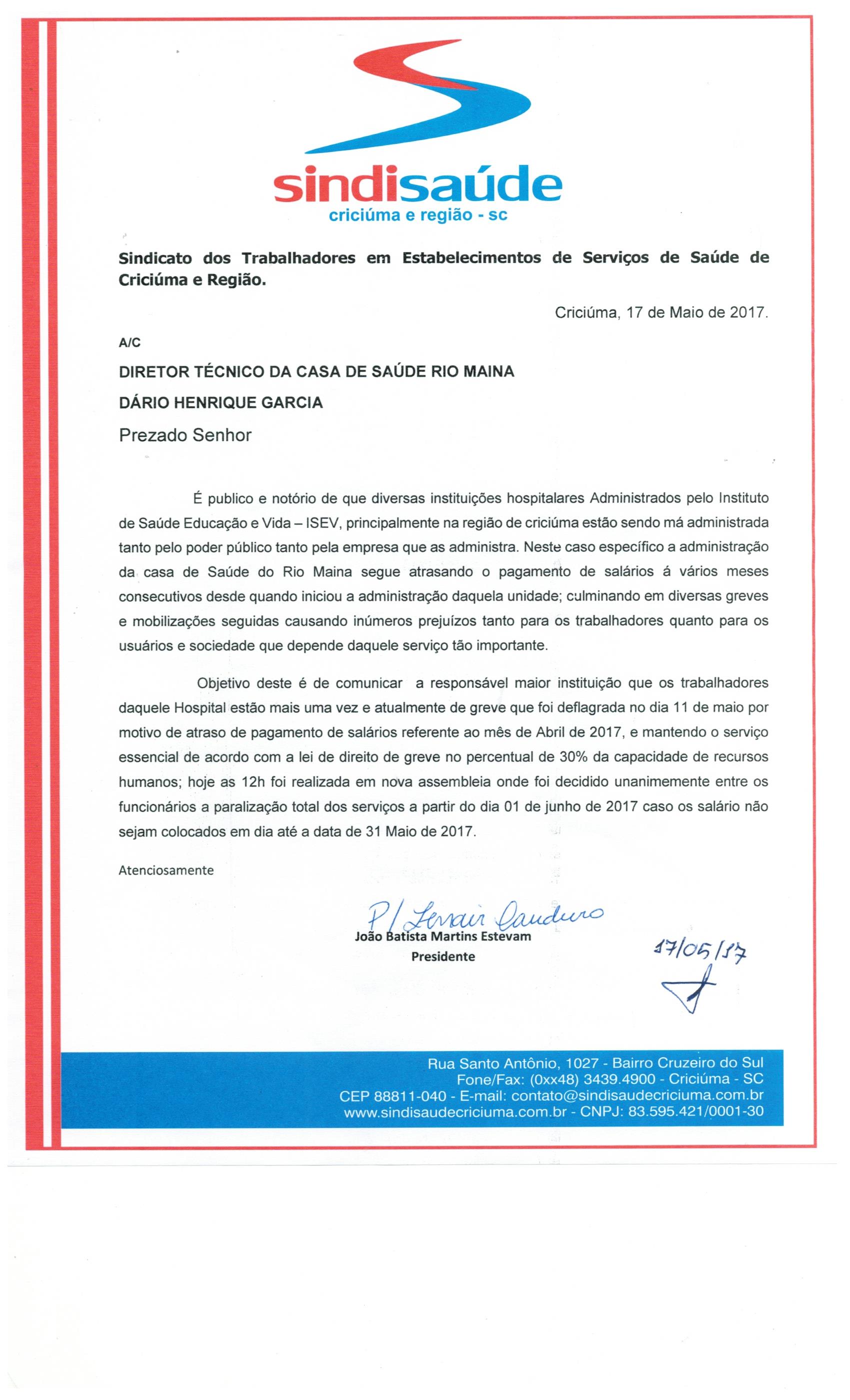 OFÍCIO ENCAMINHADO AO DIRETOR TÉCNICO DÁRIO HENRIQUE GARCIA SOBRE ISEV - CSRM