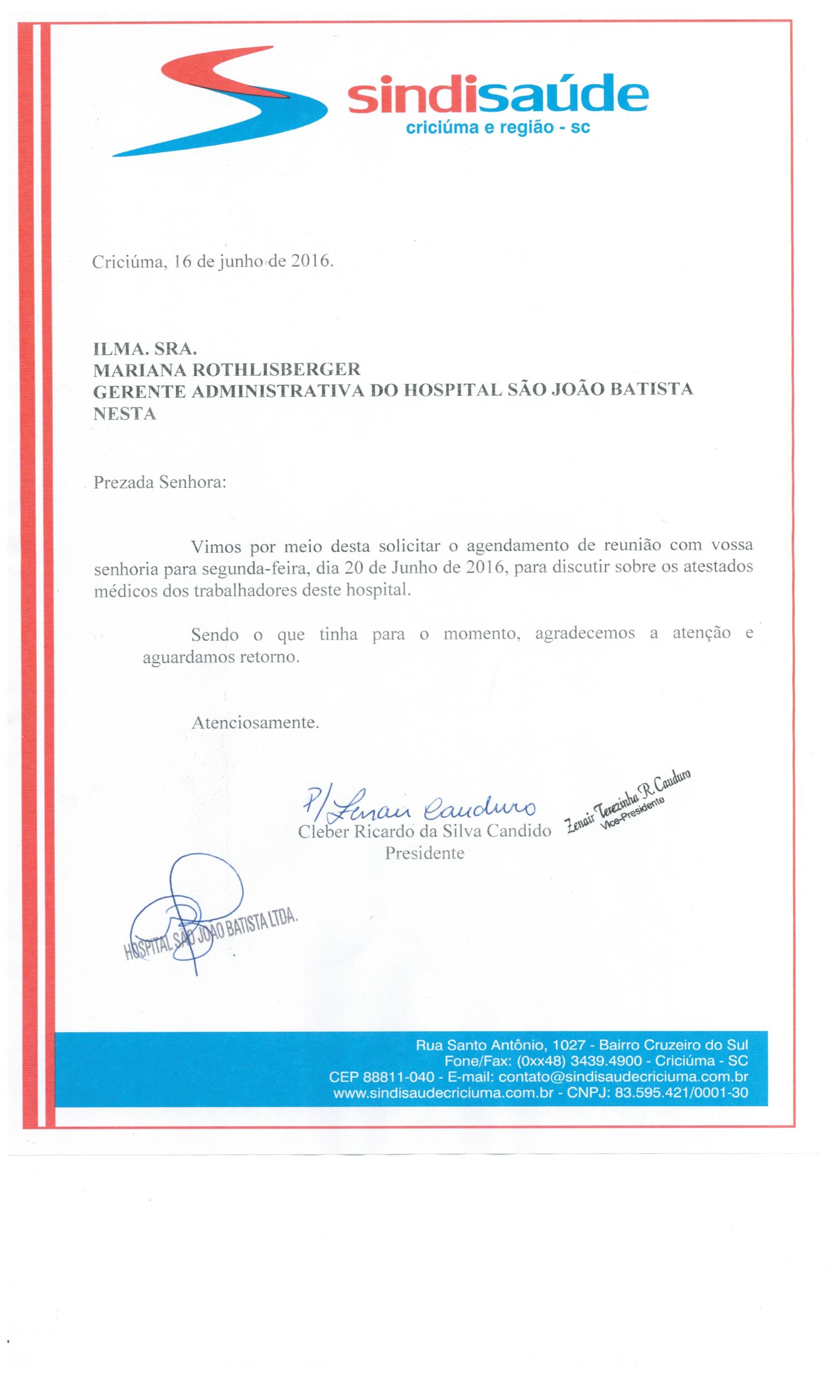 Ofício encaminhado ao Hosp. São João Batista sobre atestado médico