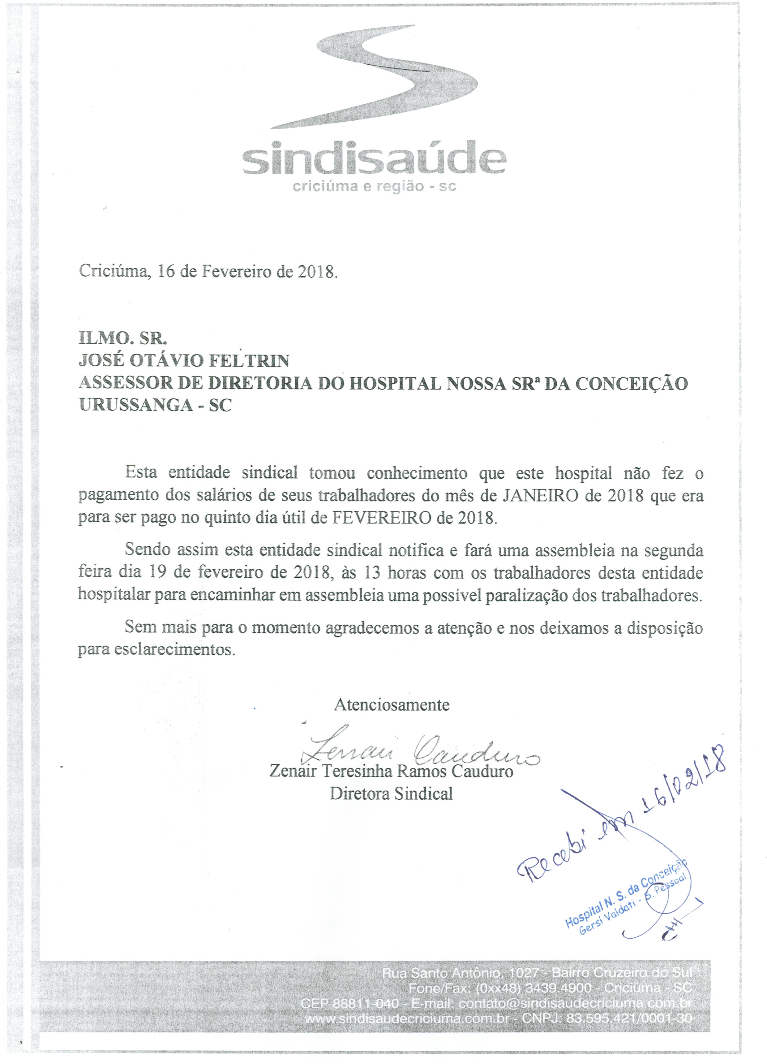 OFÍCIO ENCAMINHADO AO HOSPITAL DE URUSSANGA