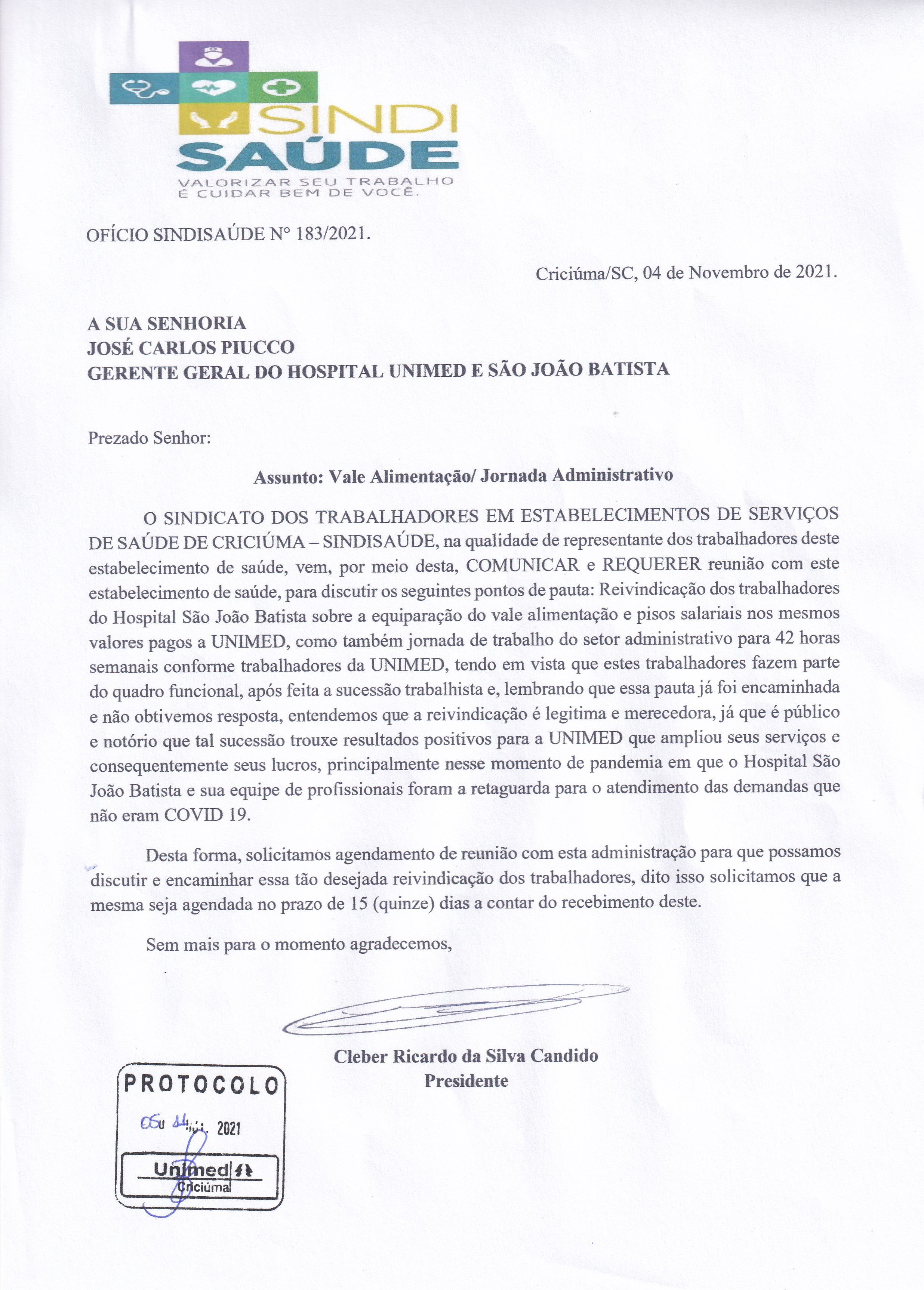 Ofício encaminhado ao Hospital Unimed e São João Batista sobre vale alimentação e jornada do administrativo