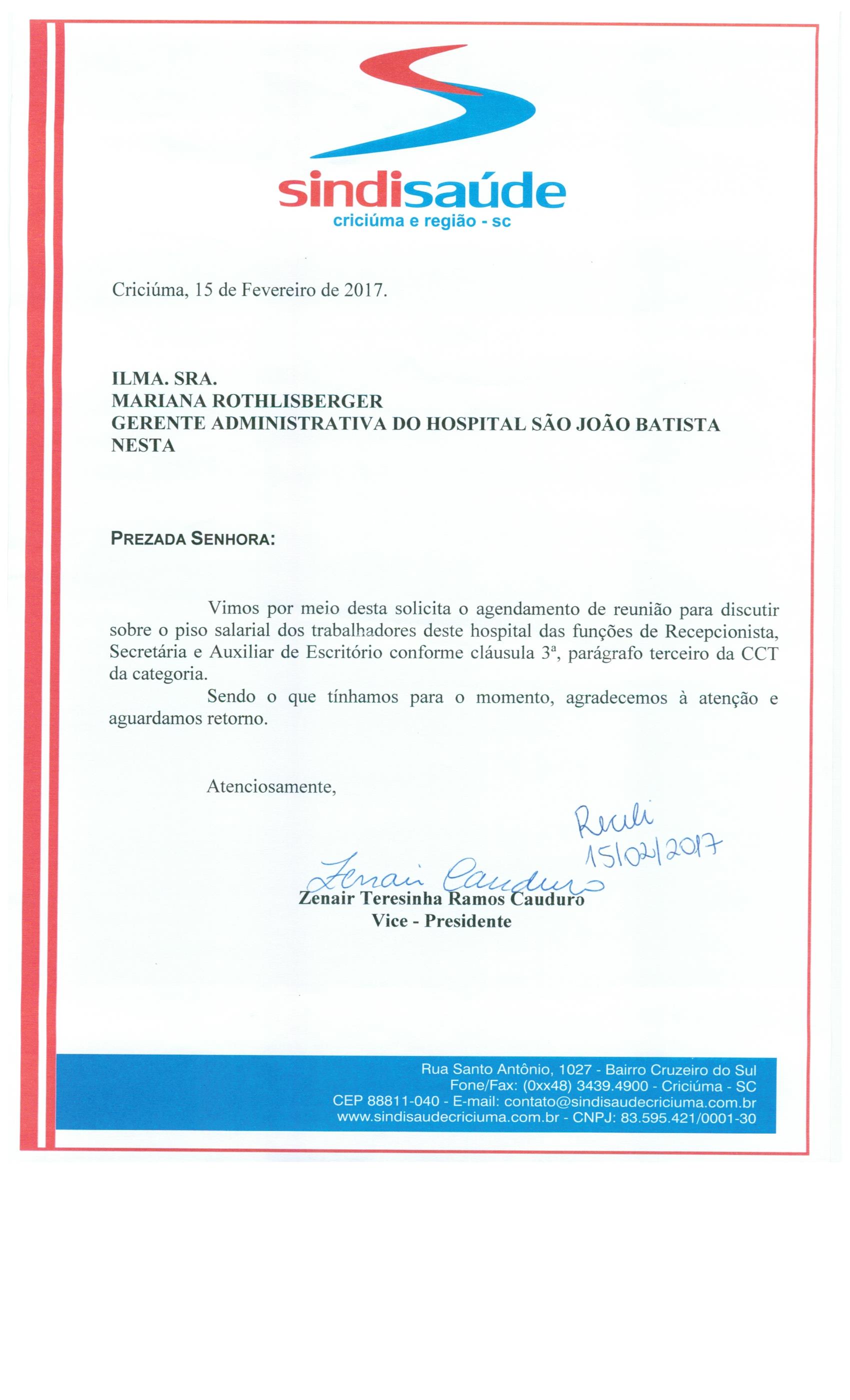 OFÍCIO ENCAMINHADO AO HSJB SOBRE PISO SALARIAL