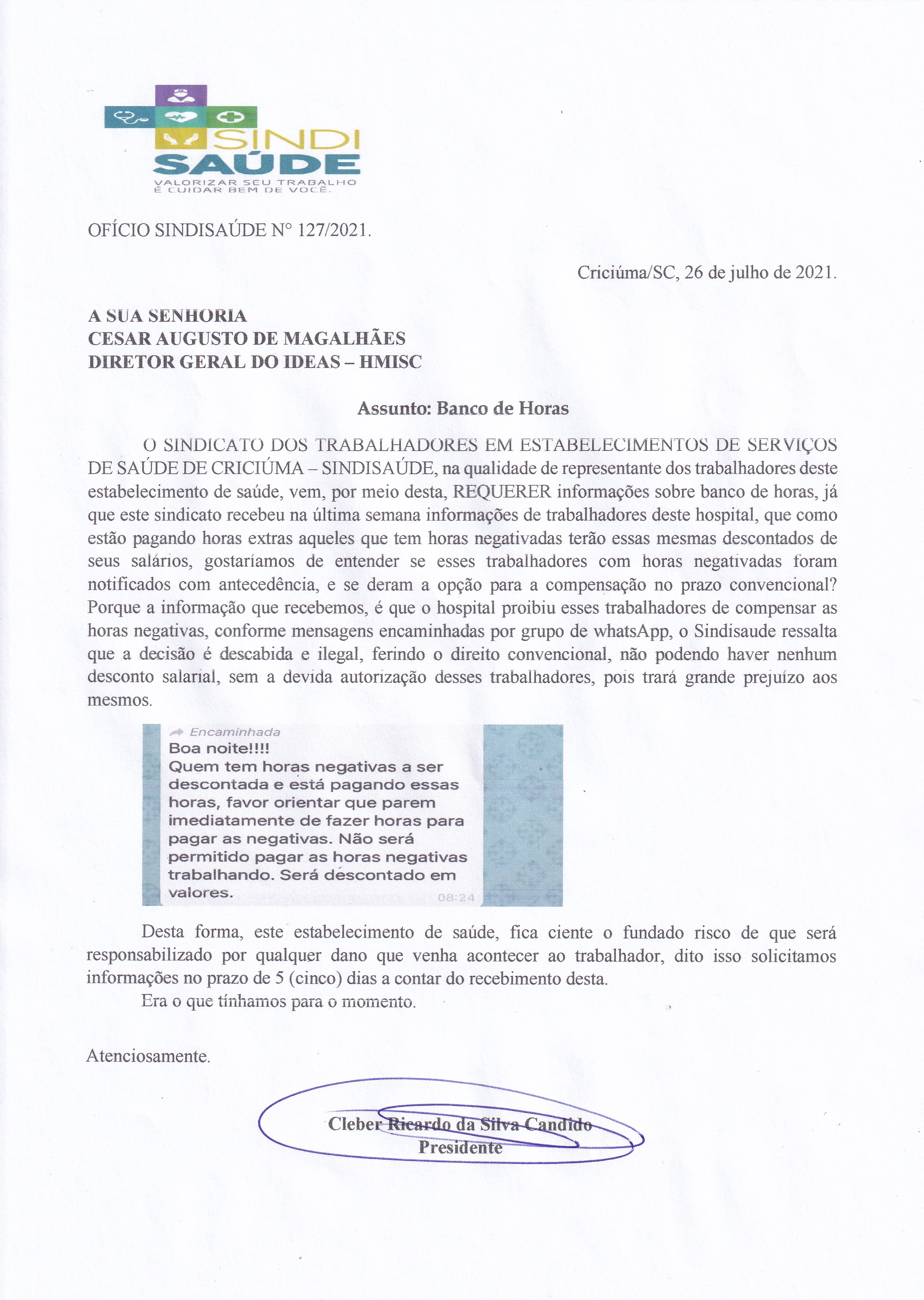 Ofício encaminhado ao IDEAS - HMISC sobre banco de horas