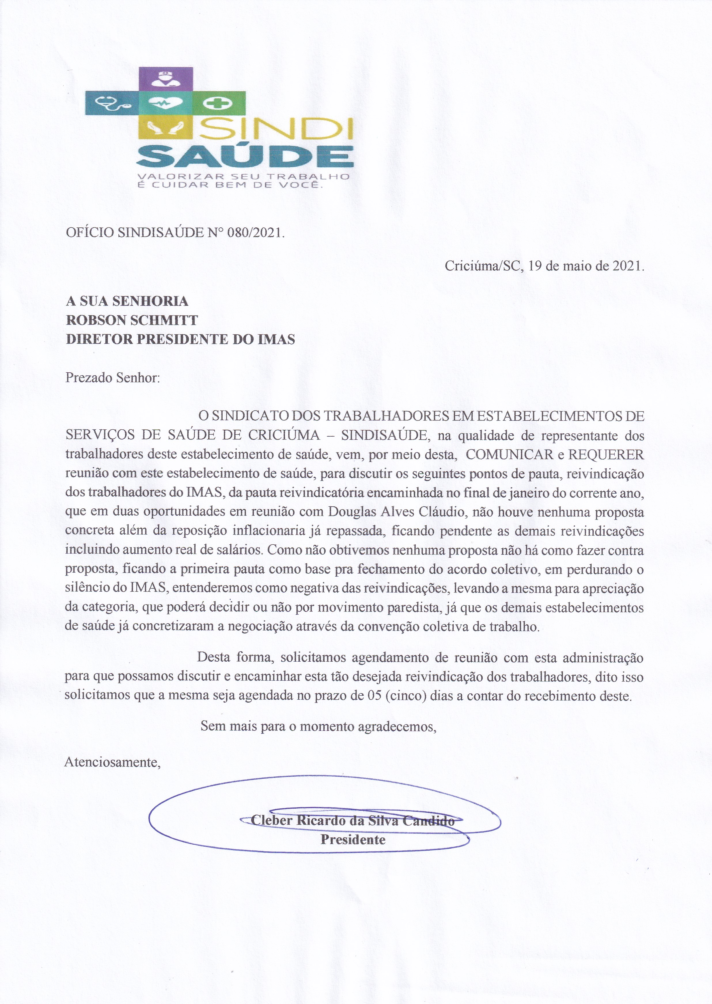 OFÍCIO ENCAMINHADO AO IMAS SOBRE NEGOCIAÇÃO DO ACORDO COLETIVO