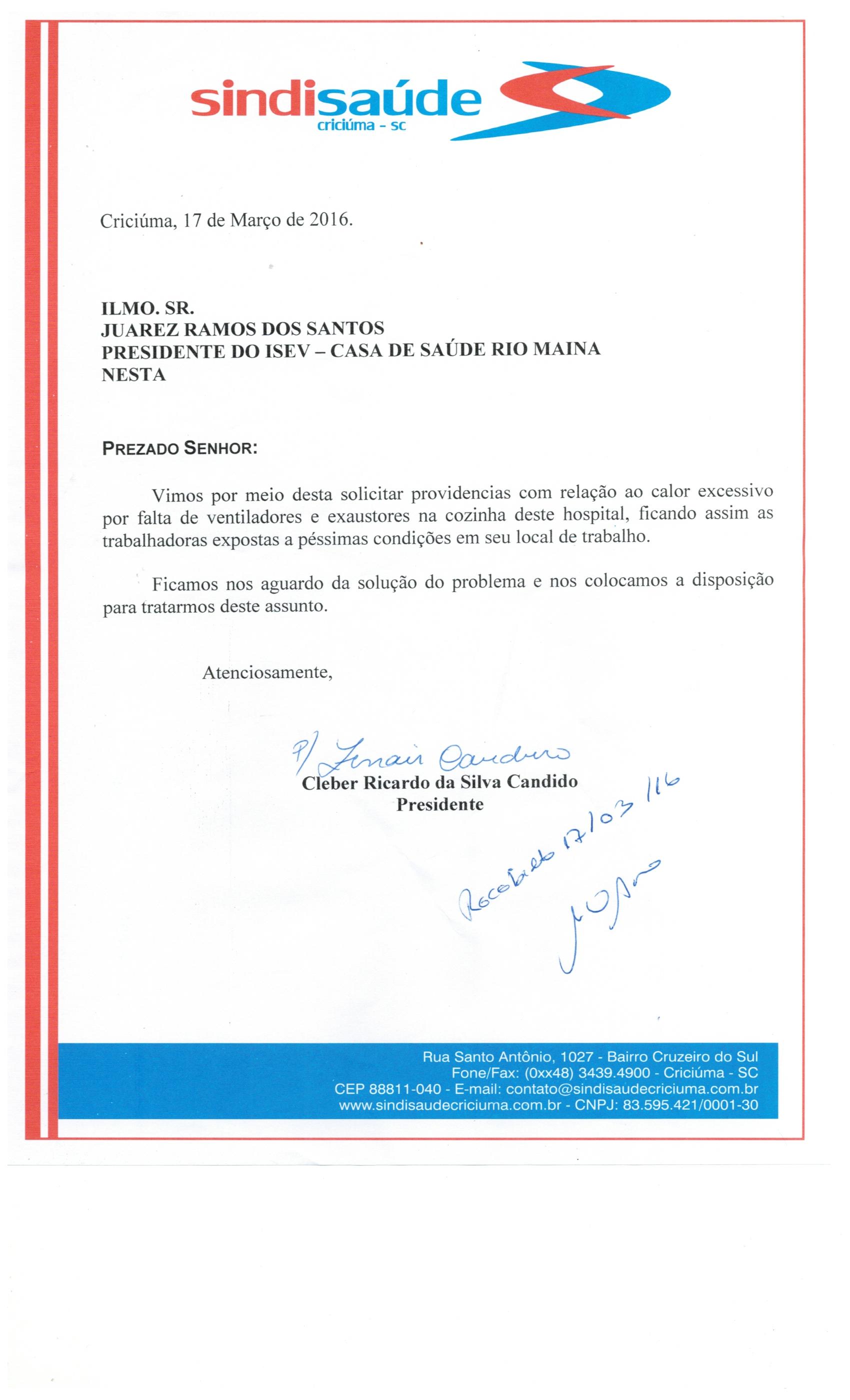 Ofício encaminhado ao ISEV - CSRM sobre falta de ventiladores cozinha