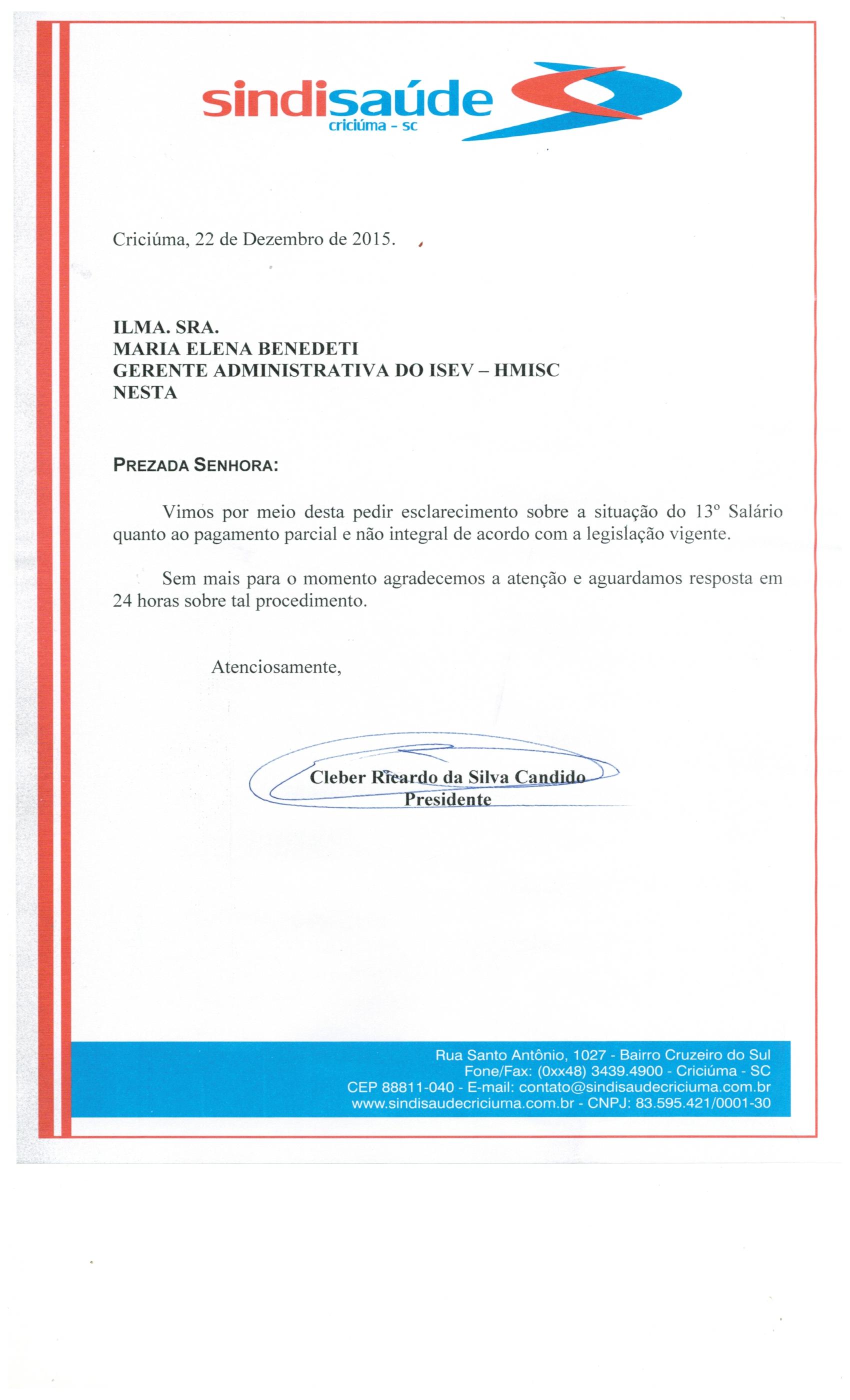 Ofício encaminhado ao ISEV - HMISC sobre o pagamento da 2ª parcela do 13º Salário.