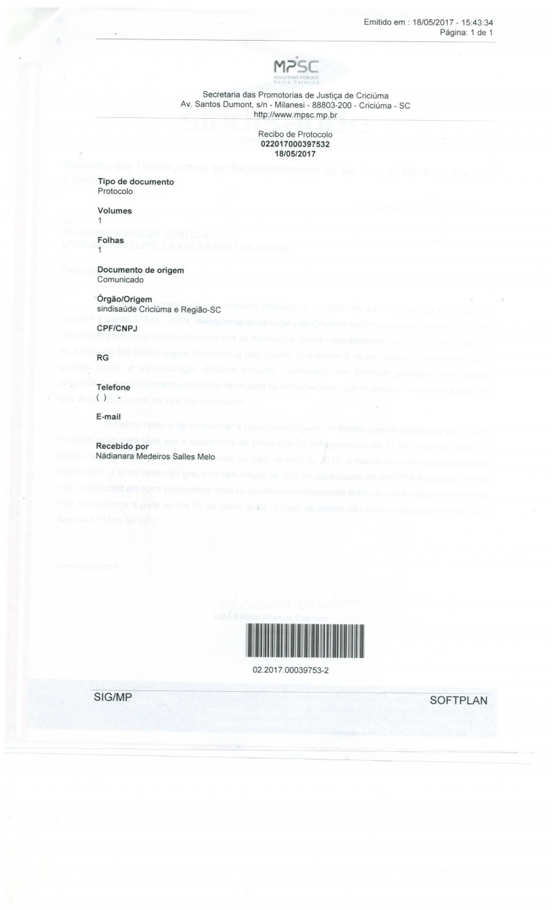 OFÍCIO ENCAMINHADO AO MINISTÉRIO PÚBLICO DO TRABALHO DE CRICIÚMA SOBRE ISEV - CSRM