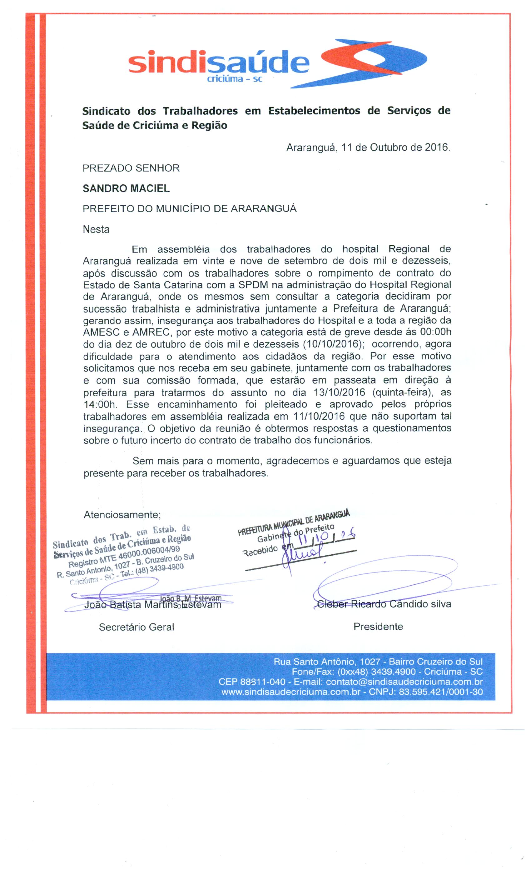 Ofício encaminhado para Sandro Maciel - Prefeito de Araranguá