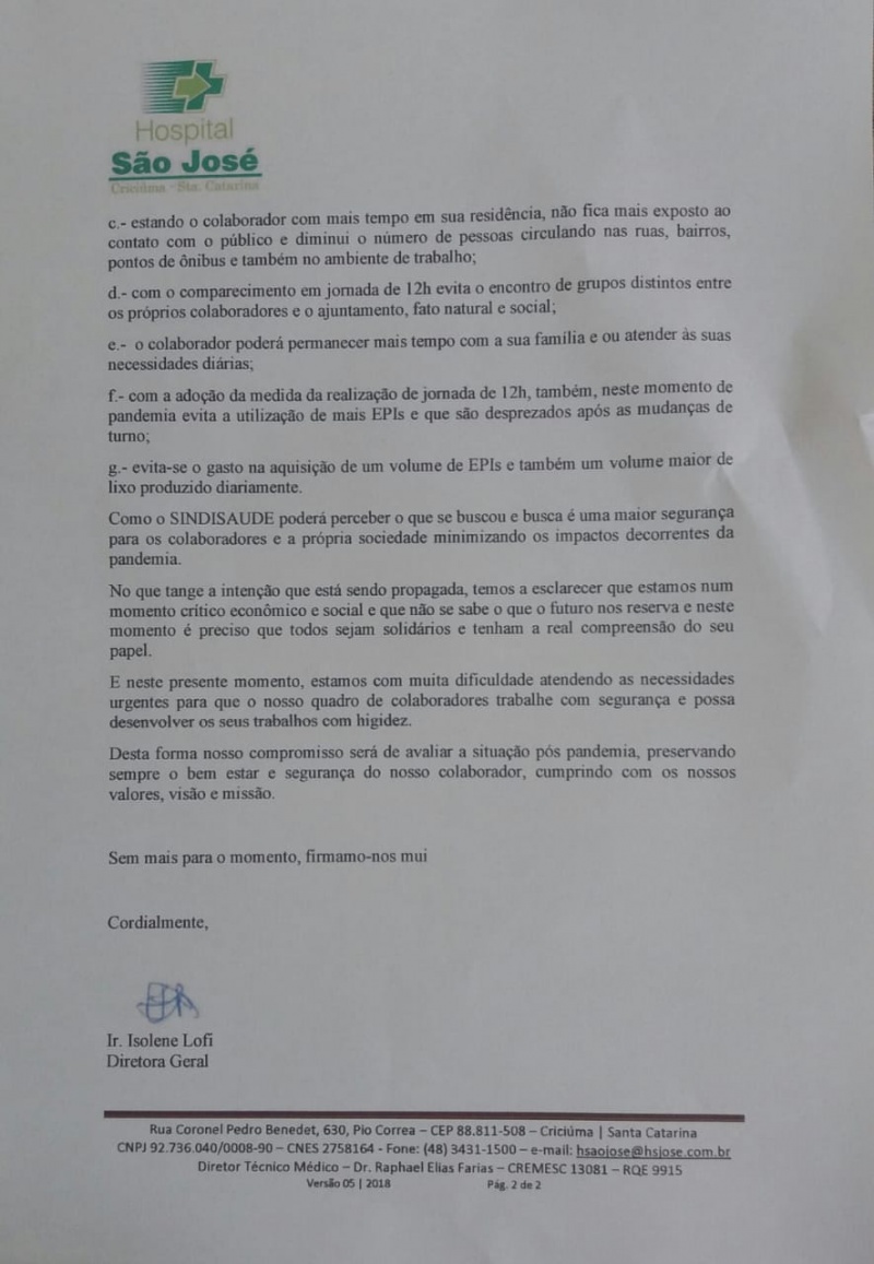OFÍCIO RESPOSTA DO HOSPITAL SÃO JOSÉ SOBRE JORNADA 12 X 36