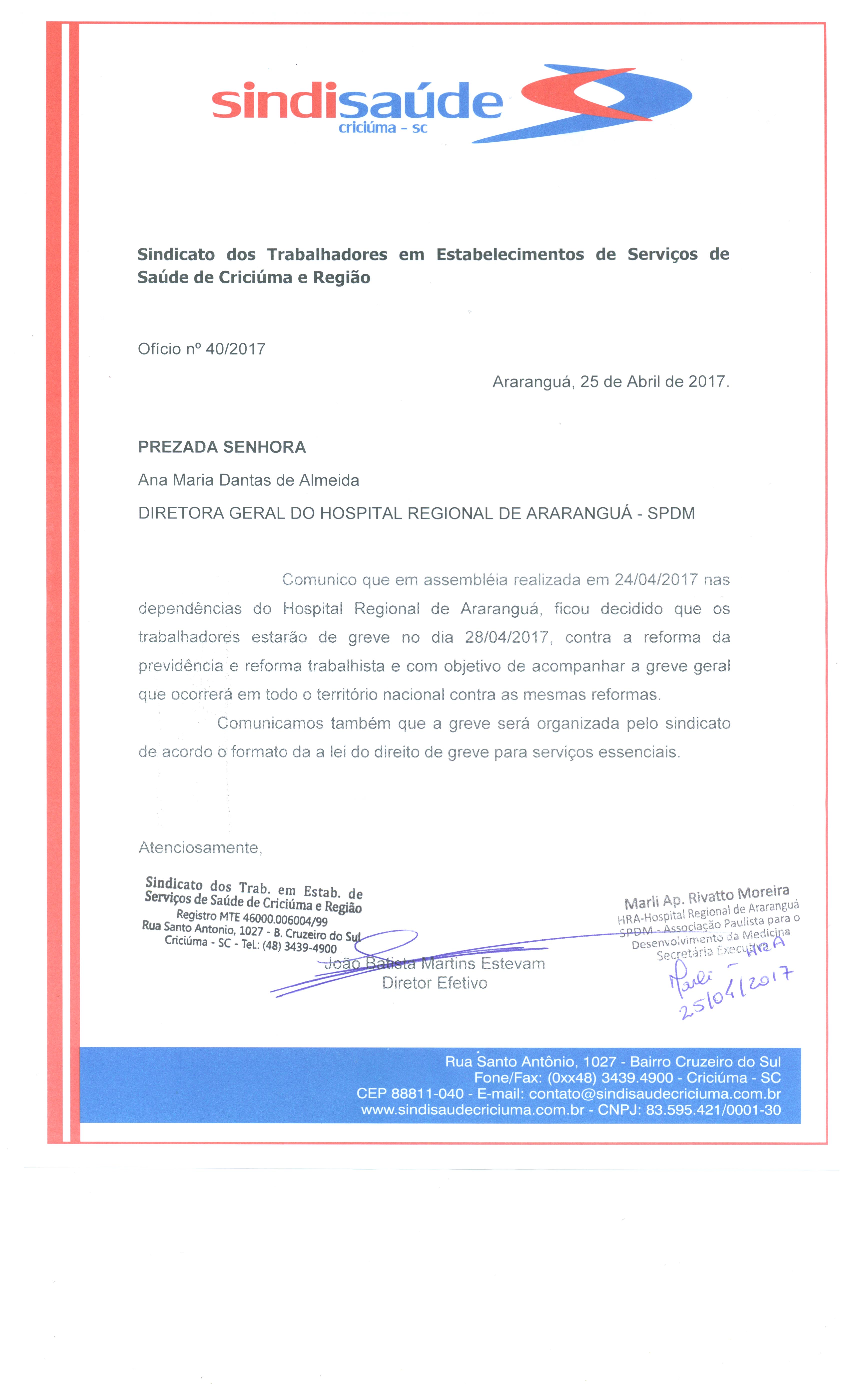 OFÍCIO SOBRE A GREVE GERAL DIA 28/04 HOSPITAL REGIONAL DE ARARANGUÁ