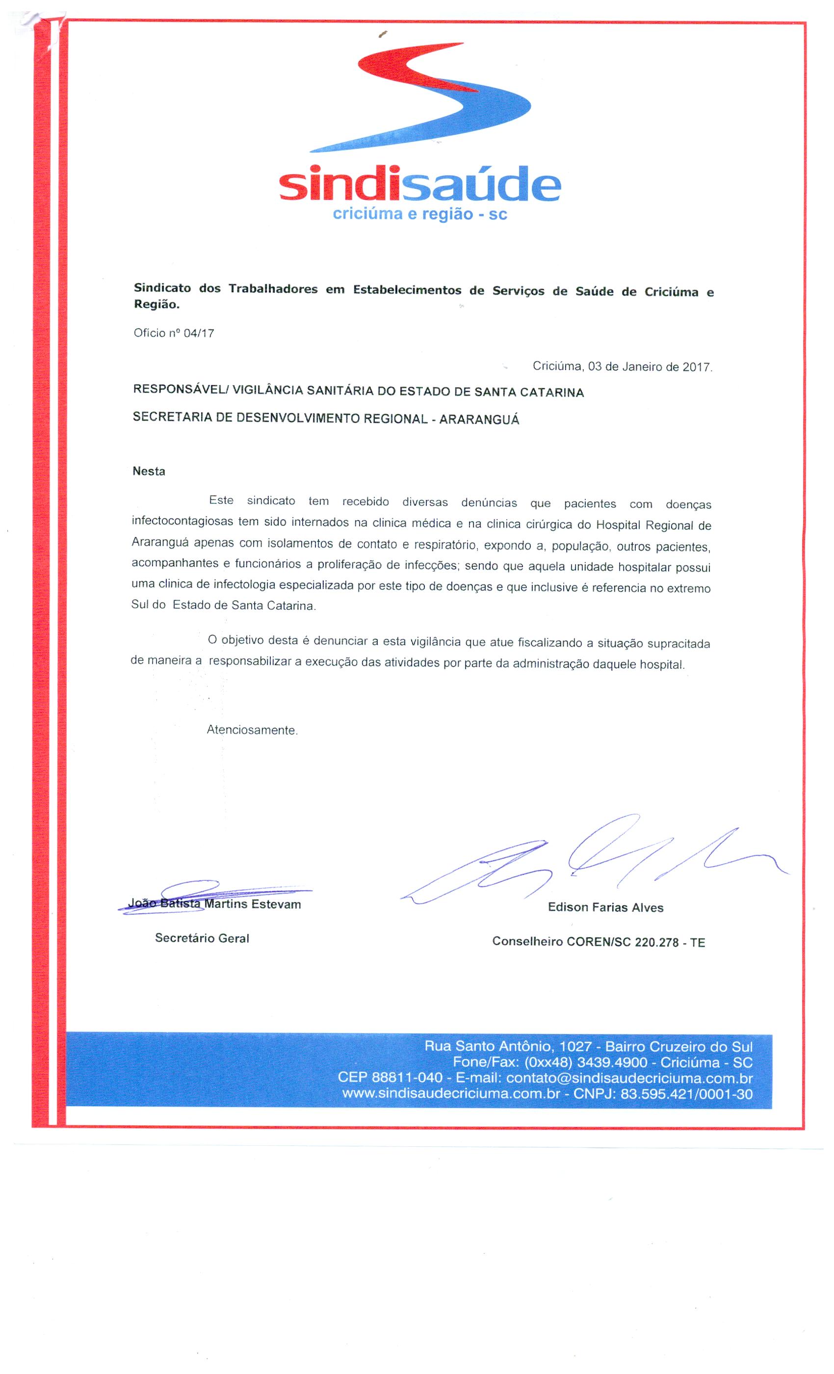 No dia 10 de janeiro de 2017, eu João Batista Martins Estevam, representante dos trabalhadores da saúde da região da AMESC e AMREC, fui até a vigilância sanitária do Estado de Santa Catarina a fim de protocolar ofício ( post acima ) solicitando verificação das internações de pacientes com doenças infectocontagiosas nas clinicas de internação como a cirúrgica e médica ao invés da internarem clínica de infectologia específica para isso do Hospital Regional de Araranguá. Primeiramente a notícia que tivemos é de que a vigilância sanitária não podia protocolar tal documento; questionados sobre tal situação, ainda nos deram a notícia de que no ano de 2016 a mesma vigilância sanitária fez uma análise investigativa e documental de todo o método de trabalho do HRA e finalizando com o resultado de liberação de alvará para tais procedimentos em favor do mesmo hospital; resultando assim no desfecho final na questão de pacientes com suspeitas ou doenças infectocontagiosas internados na clínica médica ou cirúrgica, ou seja, segundo a Vigilância Sanitária do Estado de Canta Catarina, o Hospital Regional de Araranguá trabalha de acordo com as normas hora vigentes em internações com pacientes com patologias infectocontagiosas.