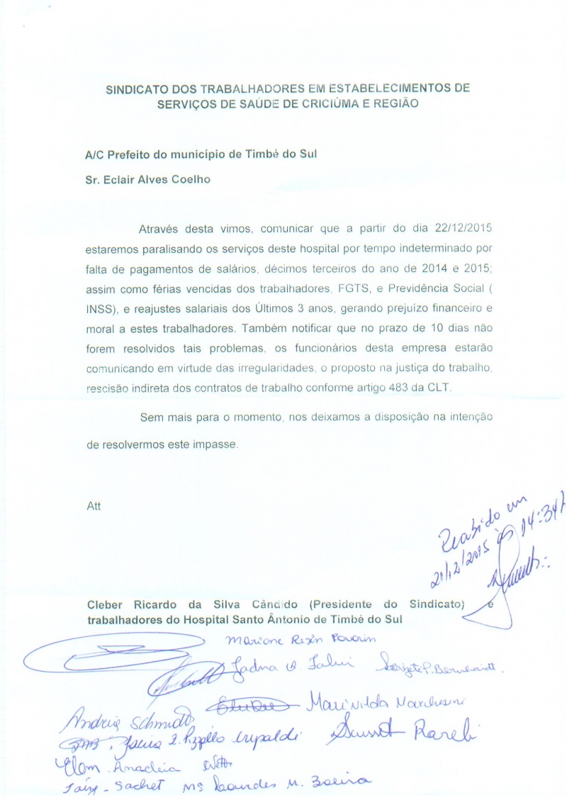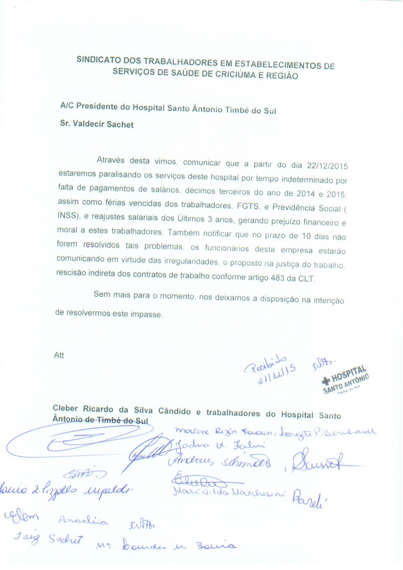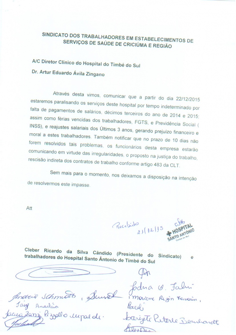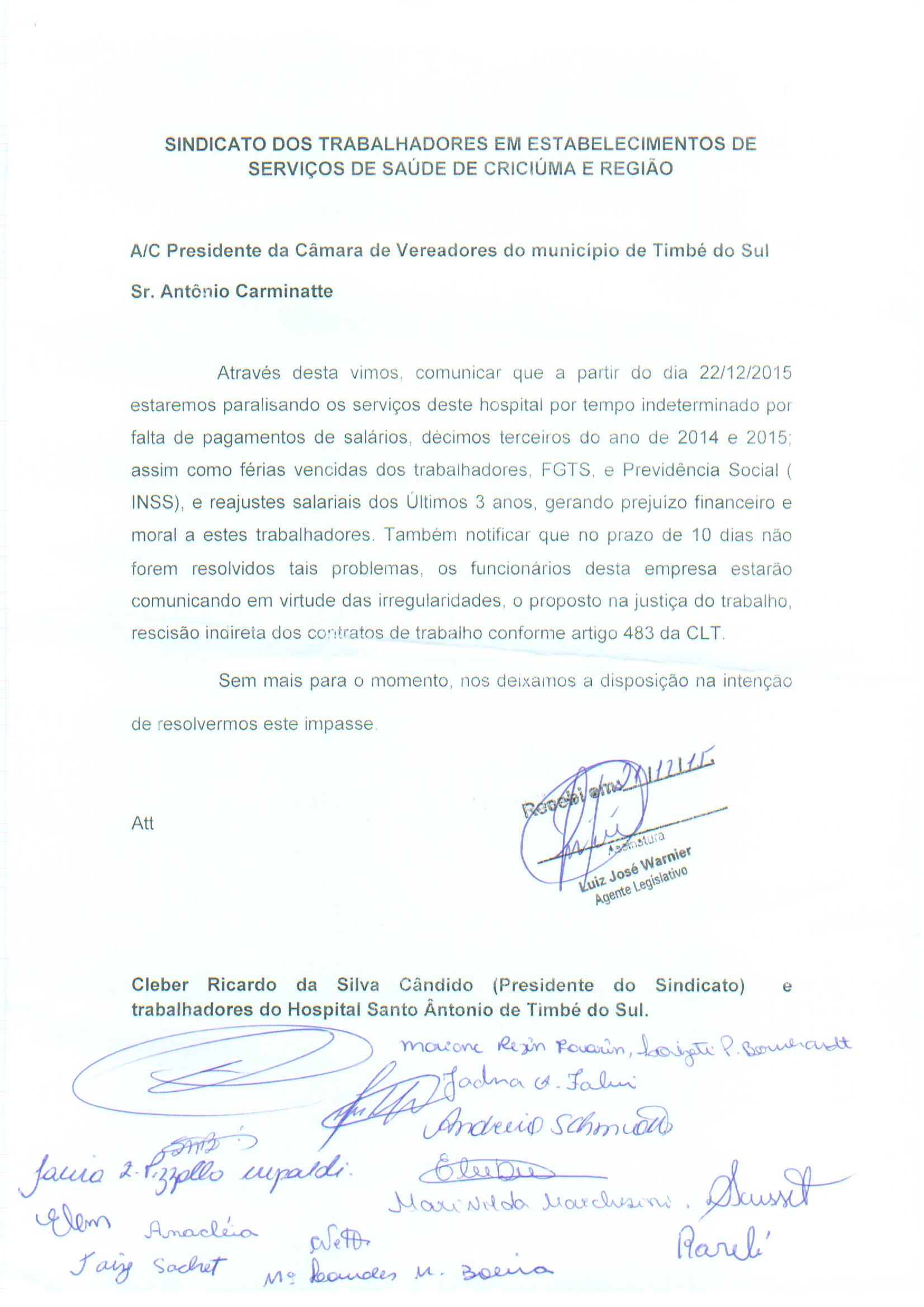 Ofícios encaminhado sobre a greve no Hospital Santo Antonio de Timbé do Sul