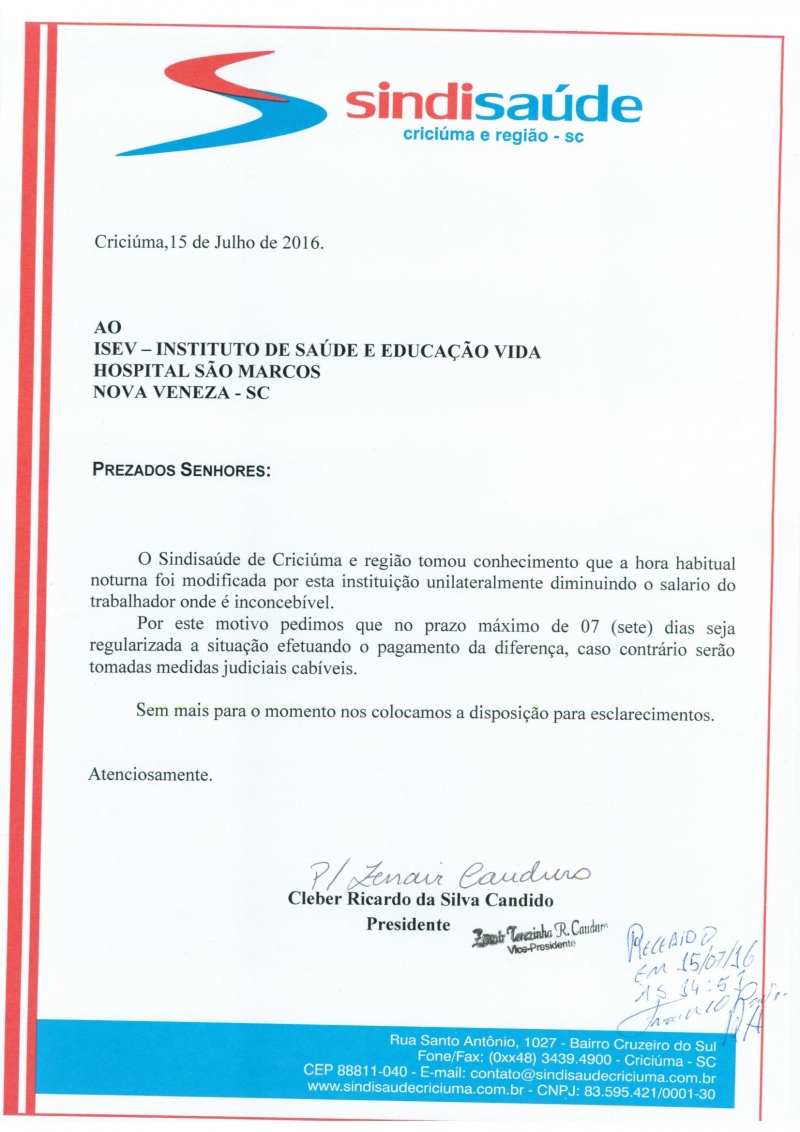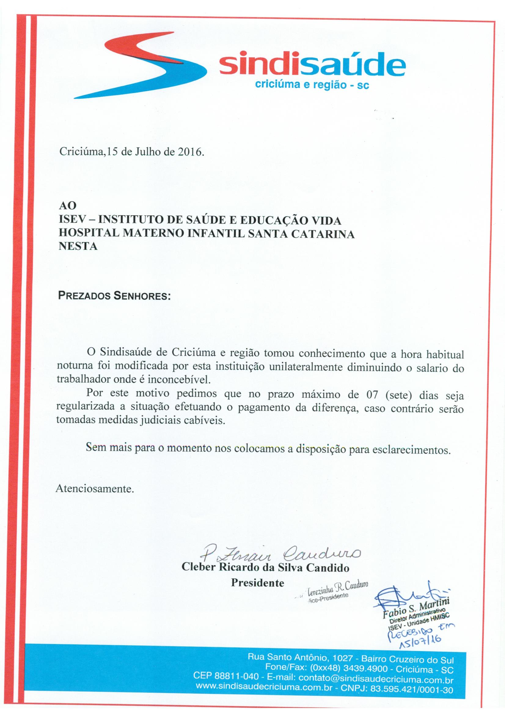 OFÍCIOS ENCAMINHADOS AO ISEV HMISC E ISEV NOVA VENEZA SOBRE HORA HABITUAL NOTURNA